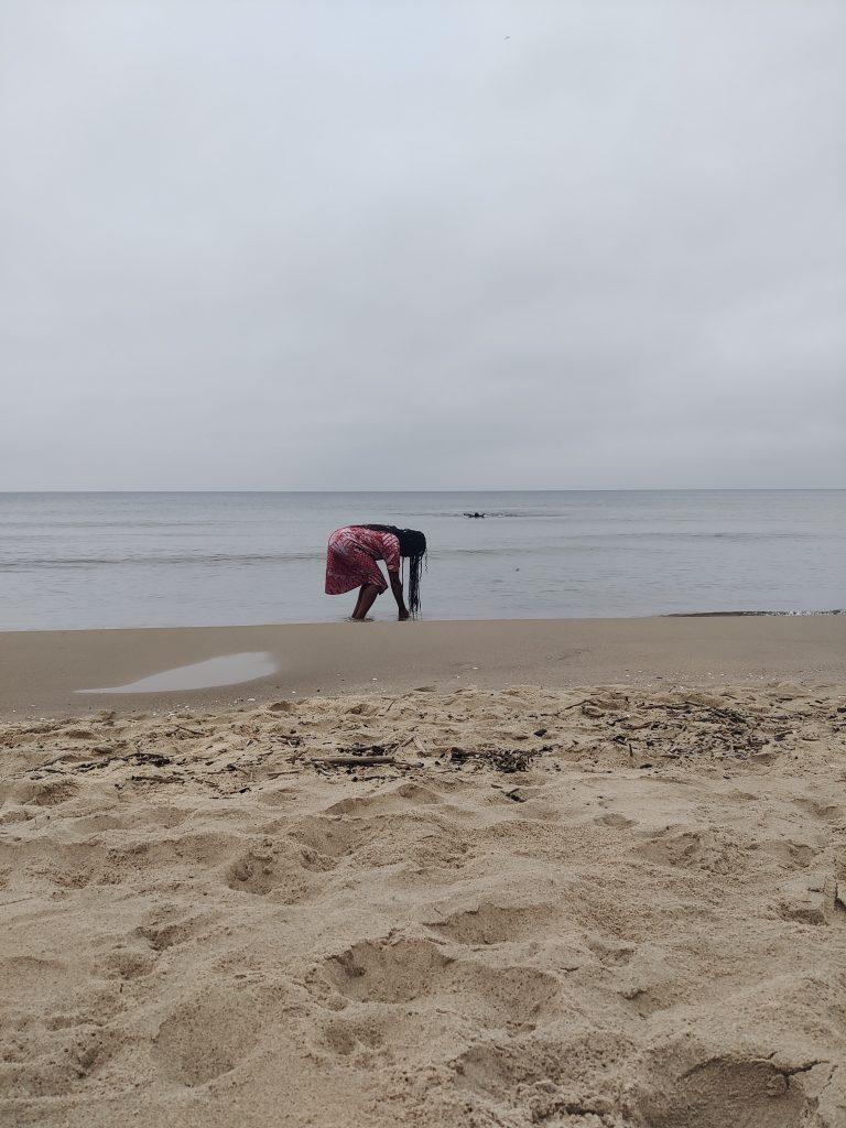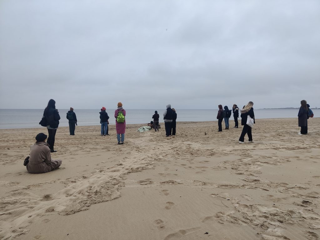 The second part of the project was an artistic residency in Gdańsk, which concluded on the beach of Sobieszewska Island with the performance The Choreography of Whales: an Interspecies Love Story. The work is part of mayfield’s ongoing project Whale Fall. The performance was followed by a discussion with the audience, including third-year students of Arts Institutions Management from the University of Gdańsk.