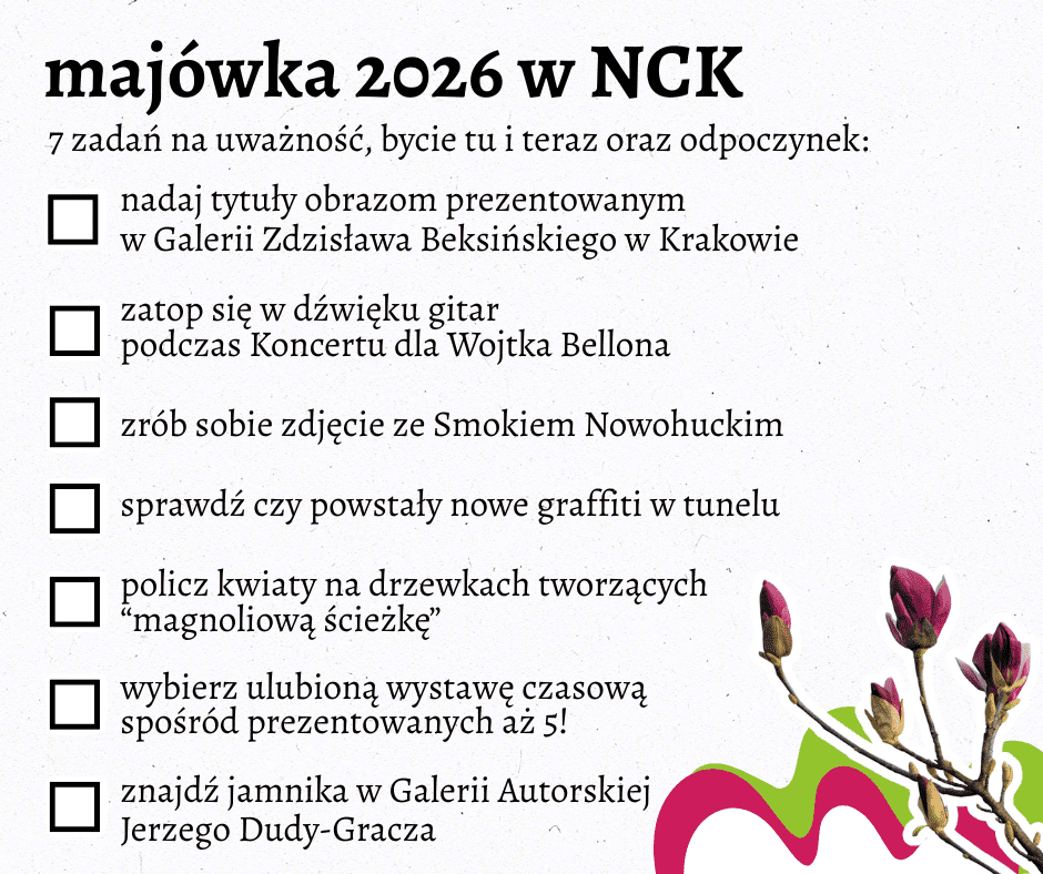 Pierwszy weekend maja – uwielbiana majówka – to szansa żeby zajrzeć do Nowohuckiego Centrum Kultury i doświadczyć prawdziwej duchowej uczty*! Dla Najlepszej Publiczności przygotowaliśmy nie tylko tradycyjny już gitarowy koncert (Koncert dla Wojtka Bellona – 3 maja, niedziela, g. 18.00, Scena NCK), ale zostawiamy też szeroko otwarte drzwi do wszystkich naszych galerii – tak, tak, przez cały weekend będą czynne nie tylko wystawy czasowe w naszych ogólnodostępnych przestrzeniach, ale też Galeria Zdzisława Beksińskiego w Krakowie i Galeria Autorska Jerzego Dudy-Gracza. Zachęcamy również do spacerów wokół naszego Centrum – warto odwiedzić Smoka Nowohuckiego, sprawdzić stan kwitnienia magnolii czy zajrzeć do tunelu, gdzie czekają nowe dzieła od artystów street artu.